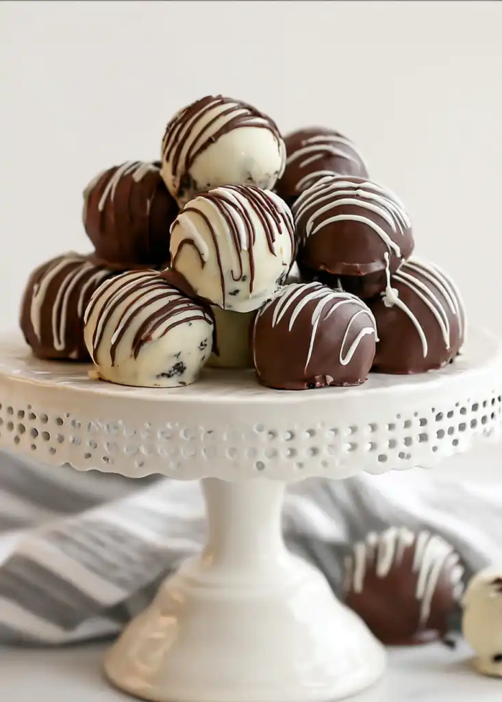 Serve these Oreo balls chilled for the best texture. They look stunning arranged on a white ceramic platter or placed individually in mini paper cupcake liners. For holiday gifting, place 6–8 truffles in a decorative tin or a clear cellophane bag tied with a festive ribbon. They are also a fantastic addition to a “dessert charcuterie board,” alongside fresh strawberries, pretzels, and nuts. Because they are so rich, a little goes a long way, making them the perfect bite-sized treat.