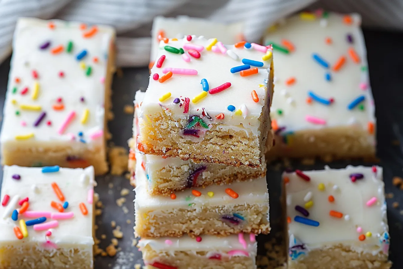 • Sprinkle Strategy: Press some extra sprinkles onto the tops of the bars after baking. This gives them a vibrant, festive look that won’t fade in the oven.