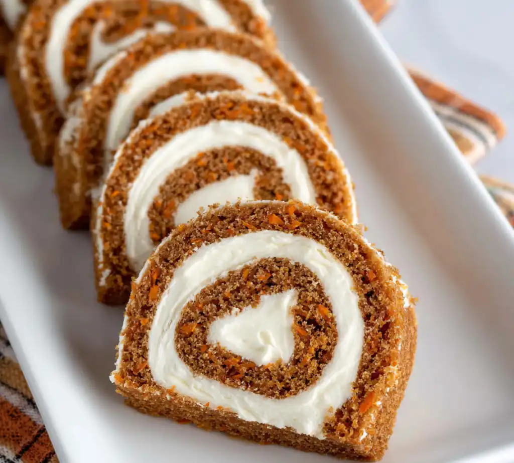 Serve this Carrot Cake Roll on a long rectangular platter to emphasize its elegant shape. A light dusting of powdered sugar over the top right before serving adds a touch of “snowy” sweetness. For a gourmet look, garnish the plate with fresh mint leaves or small “carrots” made from orange and green tinted frosting. This dessert pairs beautifully with a cup of Earl Grey tea or a spiced latte.