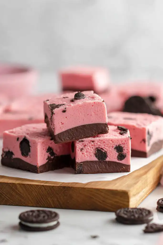 For special occasions, place each square in individual candy cups and arrange them in gift boxes. The pink and dark chocolate color combination makes this fudge particularly stunning for Valentine’s Day, bridal showers, or baby showers. Consider pairing it with our stuffed red velvet cookies and peanut butter Nutella cookies for an impressive dessert spread.