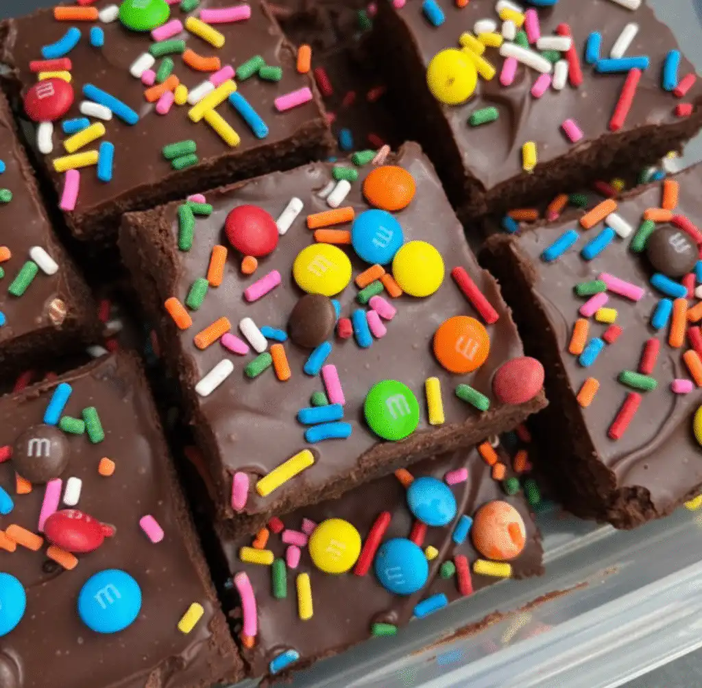 The final touch is the classic decoration. I use 4 tablespoons of mini M&Ms and 2 tablespoons of rainbow sprinkles for maximum visual impact. This simple addition is what makes the brownie Google Discover gold—the colors pop off the screen!