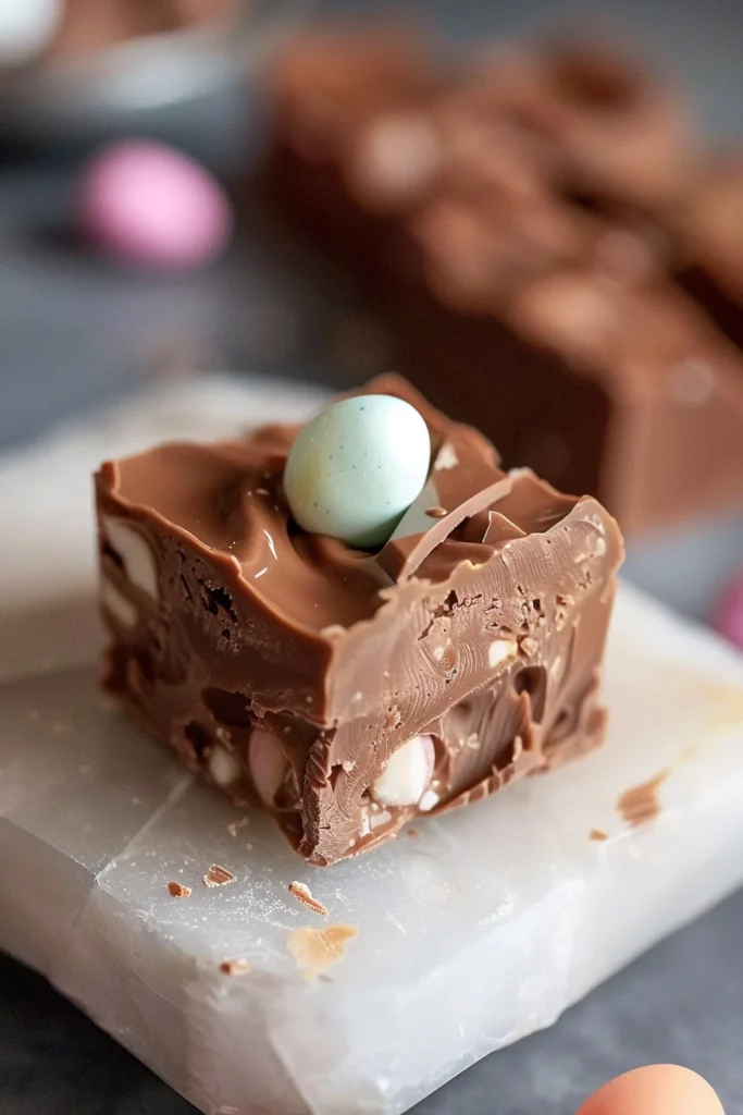 This fudge is incredibly rich, so I recommend slicing it into small 1-inch squares. For a festive gathering, place the squares into individual pastel-colored mini cupcake liners. It prevents the fudge from sticking to fingers and looks beautiful on a dessert platter. If you’re feeling extra fancy, serve a square of fudge alongside a cup of strong espresso or a glass of cold milk. It also makes a fantastic addition to an Easter Grazing Board, nestled between fresh strawberries, hot cross buns, and marshmallow chicks.