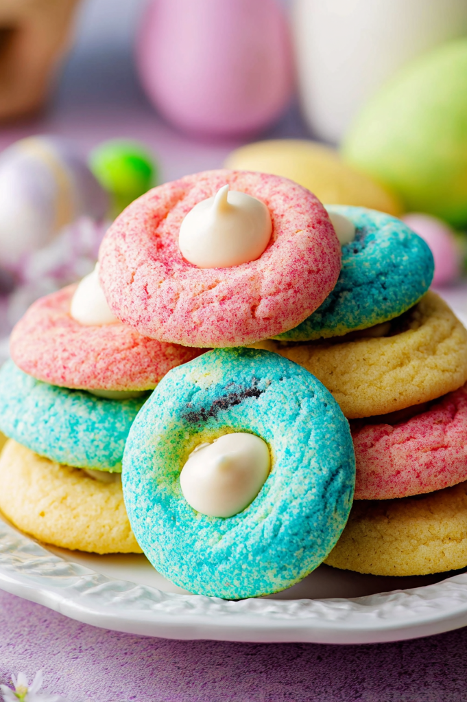 These Easter Blossom Cookies are soft, buttery sugar cookies rolled in pastel sanding sugar and topped with a classic Hershey Hug. Lightly crisp on the outside, tender on the inside, and finished with a swirl of chocolate, they’re festive, colorful, and perfect for Easter celebrations.