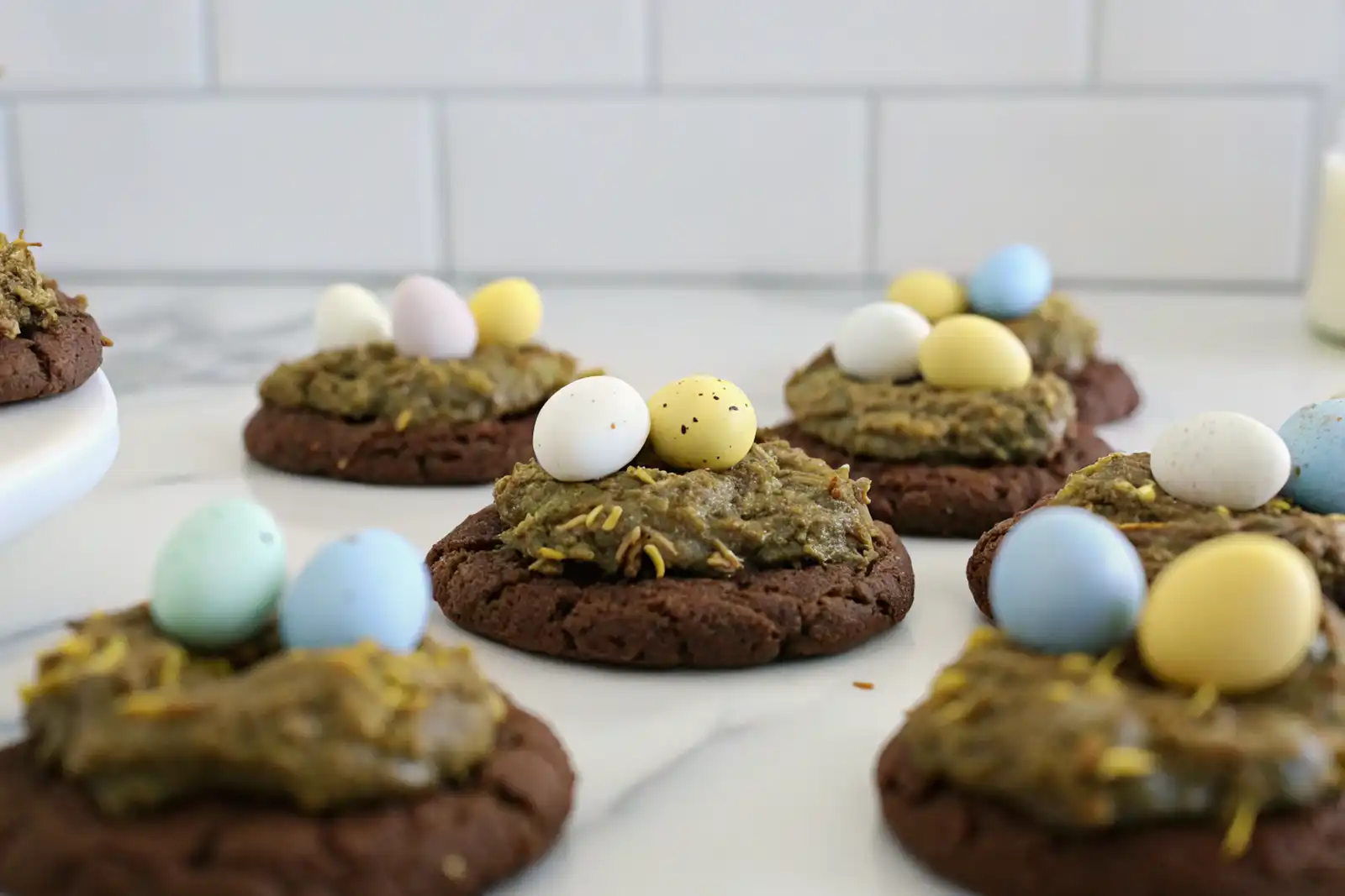 Once the cookies are cooled, scoop about 1 tablespoon of the pistachio kataifi mixture onto each cookie. Press 2–3 chocolate Easter egg candies into the topping for a vibrant finish.