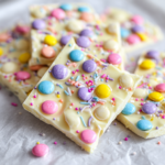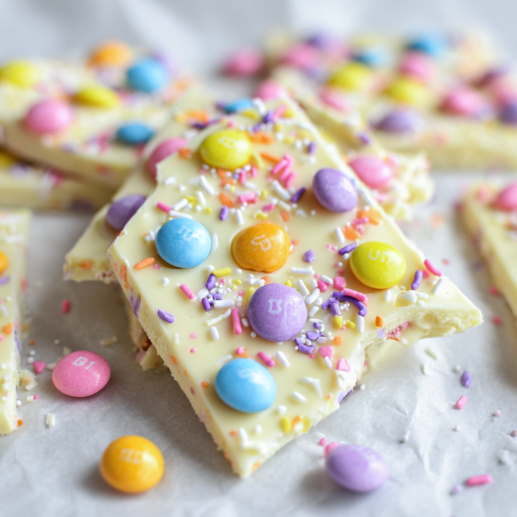 A colorful, crunchy, and creamy white chocolate bark loaded with pastel candies and spring sprinkles. The perfect no-bake treat for Easter baskets!