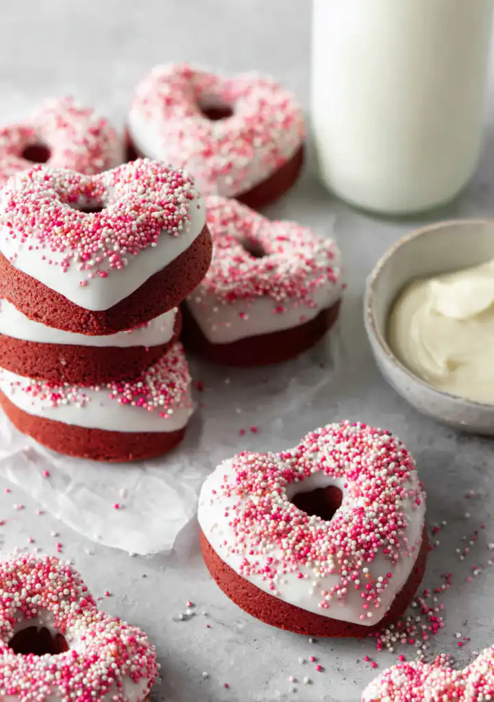 These Red Velvet Donuts are incredibly versatile for holiday planning. For Valentine’s Day, top the cream cheese glaze with heart-shaped sprinkles or a drizzle of melted white chocolate. For Christmas, a few crushed candy canes on top of the white glaze create a beautiful “Red and White” festive look. You can even turn these into “Spider-Man” themed donuts for a birthday party by using blue sprinkles. If you want an extra layer of decadence, try stuffing the centers with a little extra cream cheese frosting using a Bismarck tip, or adding chocolate chips directly into the batter for a “Double Chocolate Red Velvet” experience.