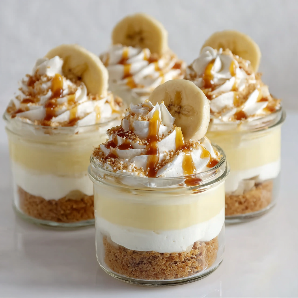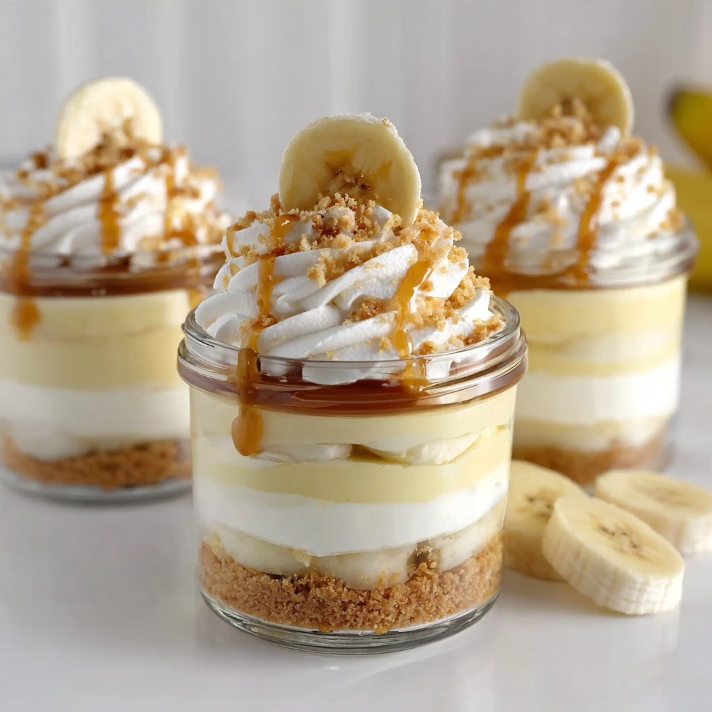 Start with 2 tablespoons of crumble at the bottom of your jars. Press down firmly. Using a piping bag (or a ziplock with the corner snipped), add a layer of pastry cream. Follow with a layer of sliced bananas, then a dollop of whipped cream. Drizzle the caramel/dulce de leche over the cream. Repeat the layers until the jar is full, finishing with a sprinkle of crumble and a fresh banana slice.