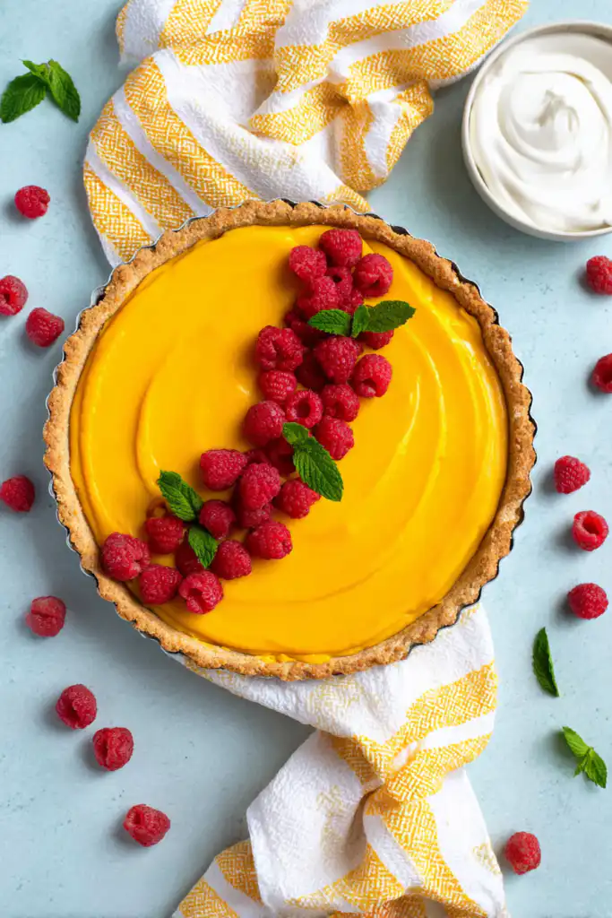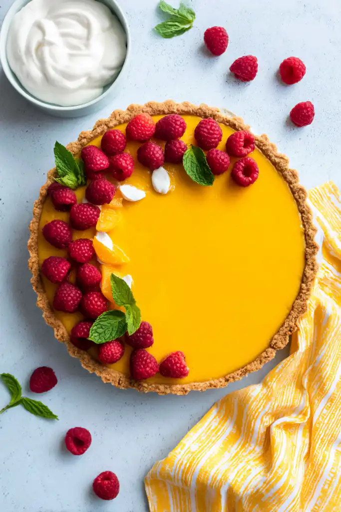 This vibrant mango curd tart is a swirl of silky, tangy curd nestled in a buttery, coconut crust. The tart is absolutely delicious and perfect for any special occasion.