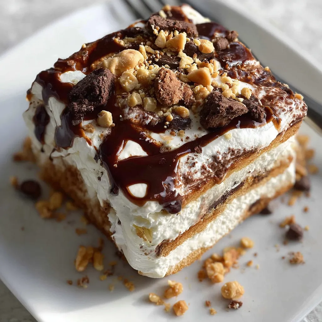 - The Middle Fillings: Pour 1 cup of the warmed hot fudge over the sandwiches. Use an offset spatula or the back of a spoon to spread it to the very edges. Drizzle half of the caramel topping over the fudge. Next, spread half of the thawed Cool Whip over the caramel layer. This acts as the “glue” for your toppings. Sprinkle half of your chocolate chips and half of the toffee pieces evenly across the surface.