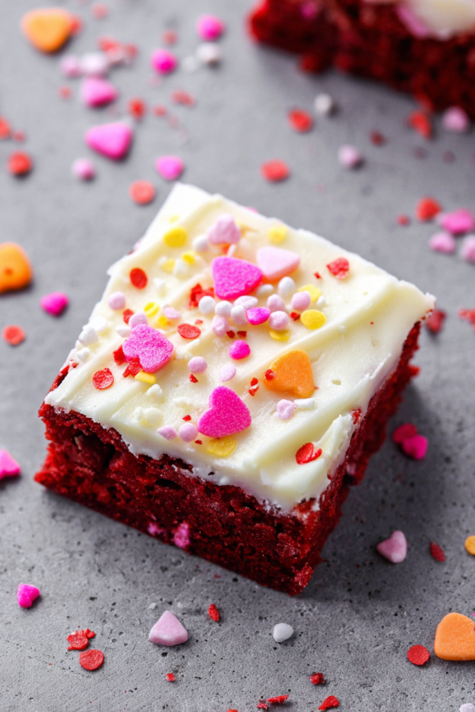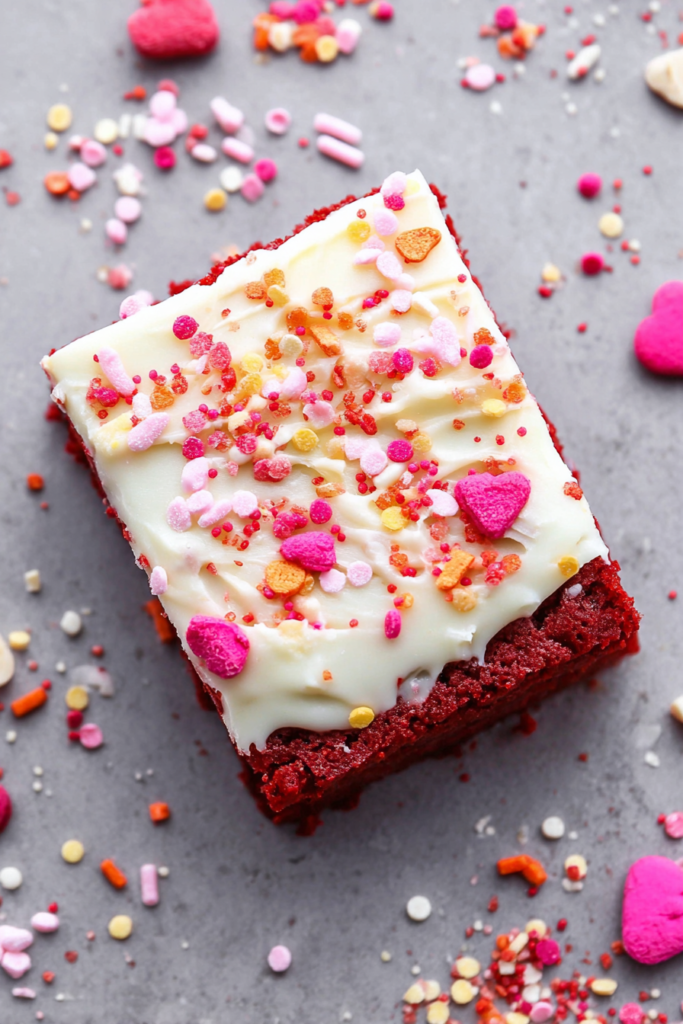 Press the red velvet dough over the frozen pink crust. Pour the ganache over the top, smoothing it with a spatula. Add your “vibrant” sprinkles and refrigerate for at least 45 minutes. Lift the foil, slice with a sharp knife, and enjoy!