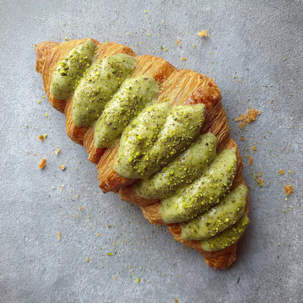 - Top with filling: Spread a thin layer of pistachio filling on top of each assembled croissant—this creates that signature bakery look.