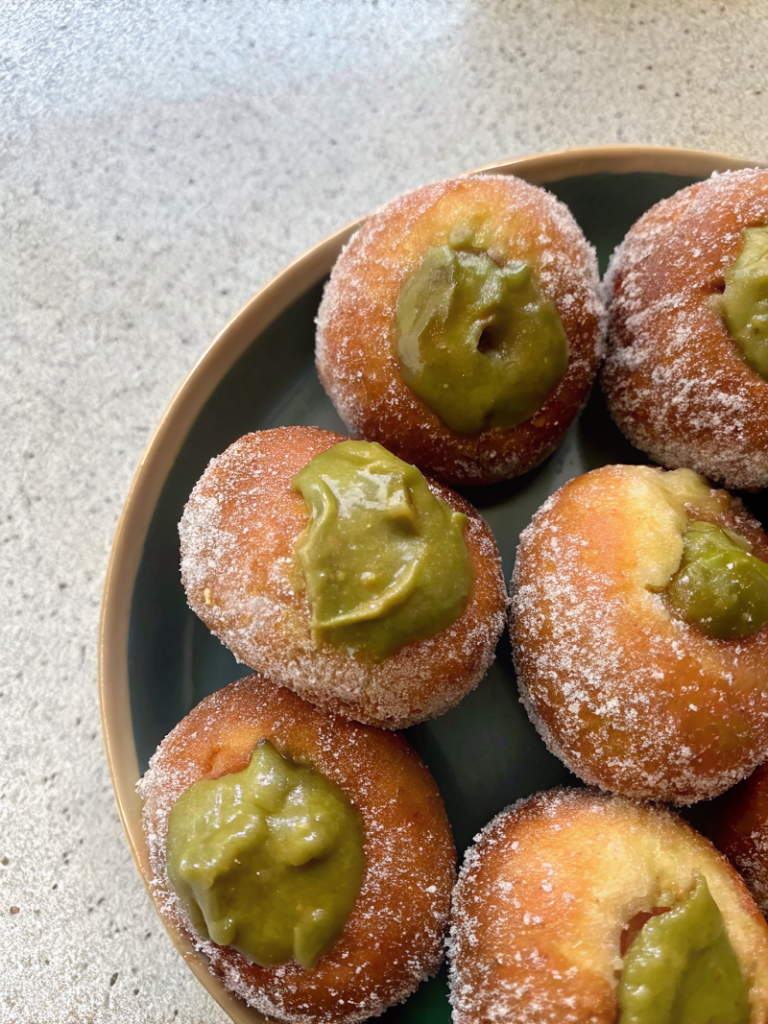 Once cooled, poke a hole in each donut and pipe pistachio cream inside until full. Serve fresh.