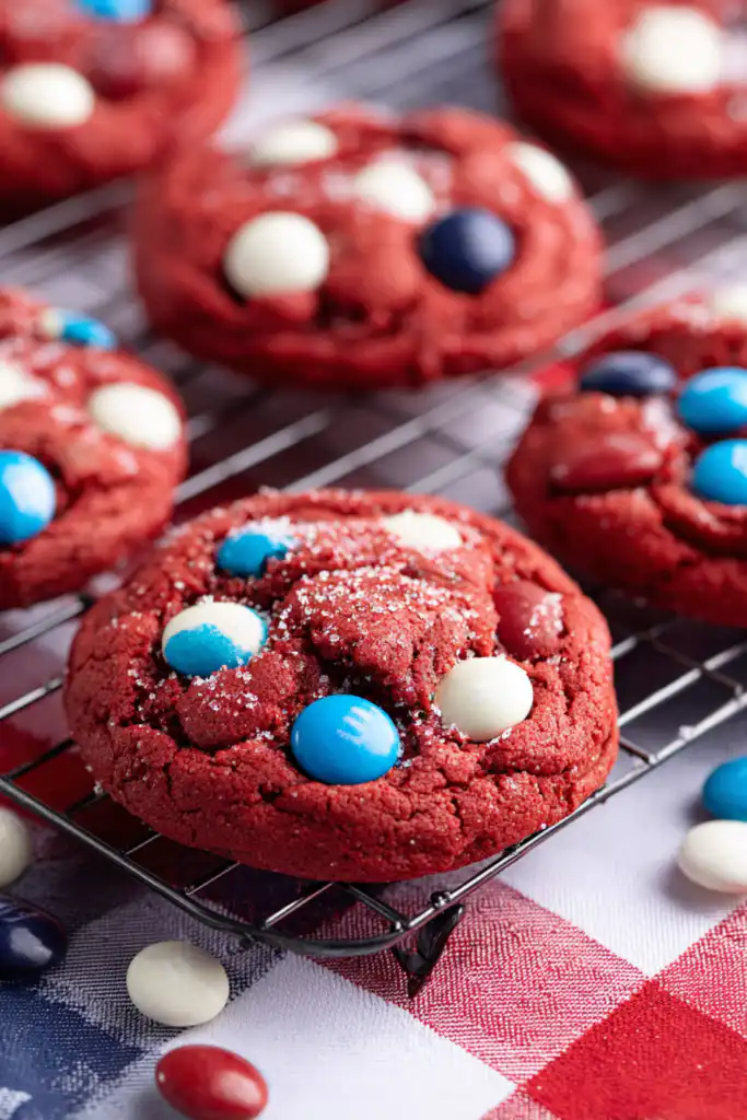 No, M&M’s are completely optional and can be replaced with any mix-in you prefer. Chocolate chips, butterscotch chips, white chocolate chunks, dried cranberries, or chopped nuts all work wonderfully. You can even make plain red velvet cookies with no mix-ins at all—they’ll still taste amazing. The M&M’s primarily add visual appeal and extra chocolate flavor, so feel free to customize based on what you have available or what your family enjoys.