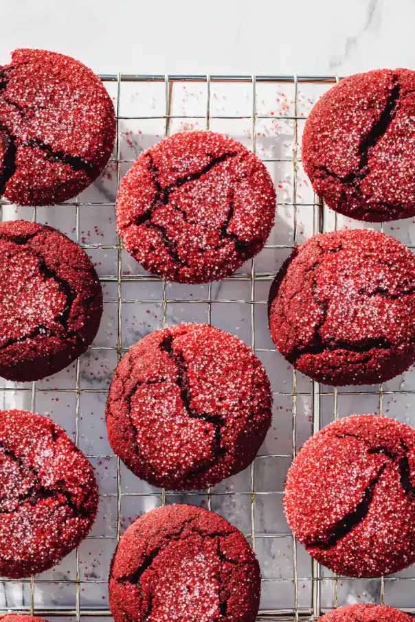 Red velvet cookies are done when the edges look set but the centers still appear slightly puffy and soft—almost underdone. They should not look dry or cracked on top. The cookies will continue baking from residual heat during the 5-minute cooling period on the baking sheet. If you wait until they look completely done in the oven, they’ll end up overbaked and dry once cooled. Trust the 8-9 minute timing and remove them even if they look questionable—this is the secret to achieving that bakery-style soft texture.
