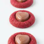 A blossom cookie is characterized by a soft cookie ball that is rolled in sugar, baked until just set, and topped with a solid chocolate candy while still warm. This specific version utilizes a red velvet base. Traditionally, red velvet was a chocolate cake that took on a reddish tint due to the reaction between non-alkalized cocoa powder and acidic ingredients like buttermilk or vinegar. In this modern cookie adaptation, we achieve that signature deep red color using food coloring, paired with a hint of cocoa powder for that classic earthy undertone. The addition of a chocolate heart turns a standard cookie into a “blossom,” creating a decorative and indulgent “crown” for the treat.