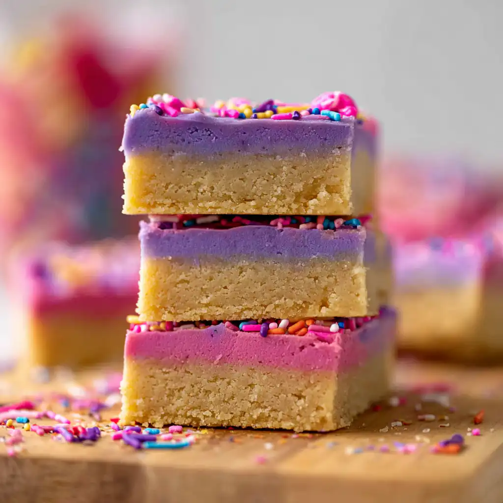 The beauty of this recipe lies in its simplicity. Forget the rolling pin and the hours of chilling dough in the fridge. We are taking all the flavors of a classic sugar cookie and pressing them into a single pan. The result? A texture that is somewhere between a soft-baked cookie and a dense blondie, finished with a swirl of pink and purple that looks like it came straight from a professional bakery.