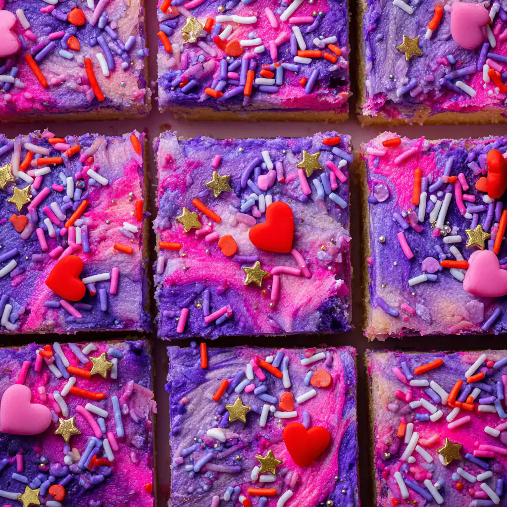 Divide the frosting and tint one half pink and the other purple. Place alternating dollops of each color onto the cooled bars. Use a butter knife to gently swirl them together. Top with your Valentine’s Day sprinkles and enjoy!