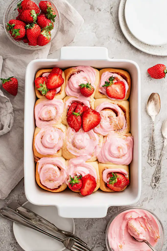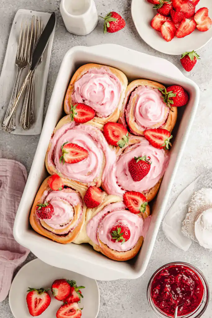 Absolutely! For make-ahead convenience, you have a couple of options. You can prepare the shaped rolls and refrigerate them overnight (up to 12-18 hours). In the morning, let them sit at room temperature for 30-60 minutes to proof slightly before baking. Alternatively, you can make the strawberry filling and cream cheese glaze a day in advance and store them separately in the refrigerator, ready to assemble and frost when the rolls are baked.