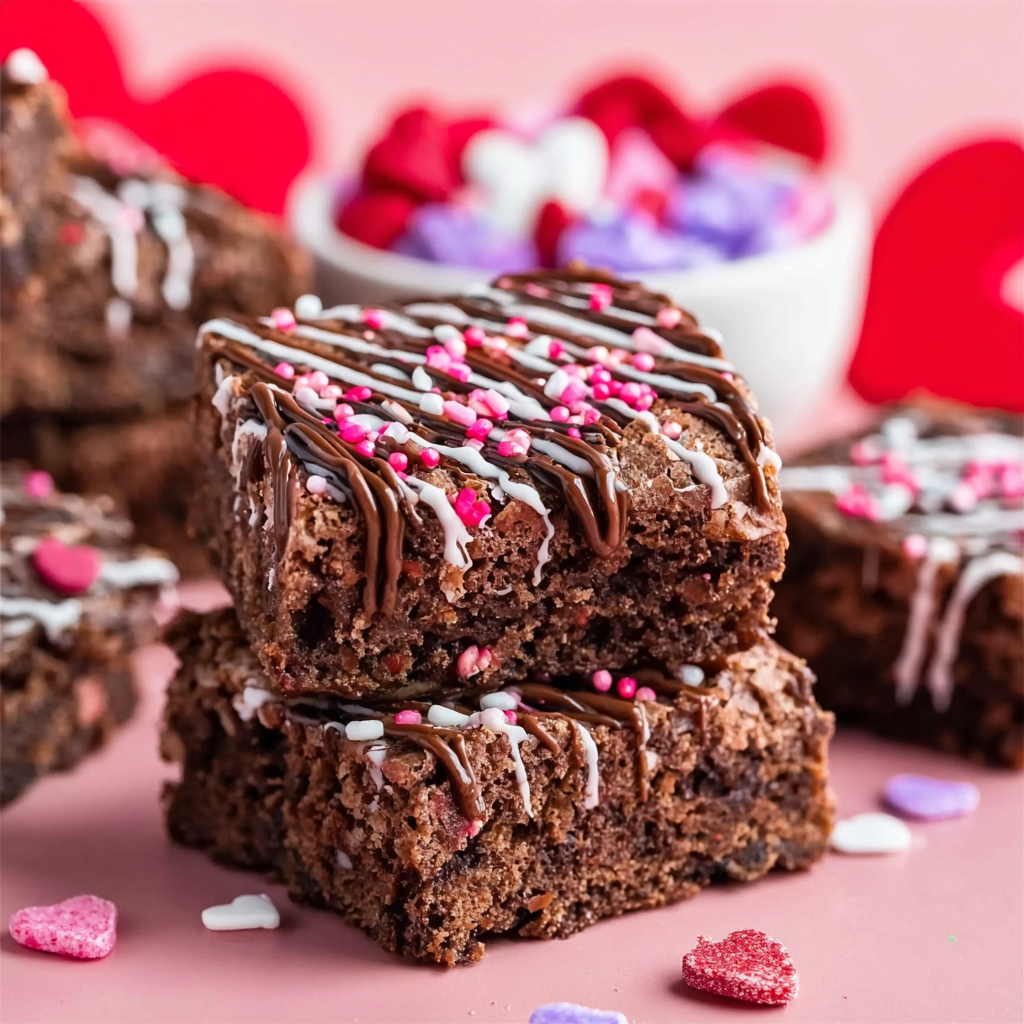 The decorative chocolate drizzle and Valentine sprinkles transform these brownies from everyday dessert into stunning celebration treats that look professionally crafted. Whether you’re baking for classroom parties, romantic dinners, Galentine’s gatherings, or simply treating yourself, these brownies deliver impressive results with minimal effort and maximum chocolate satisfaction.