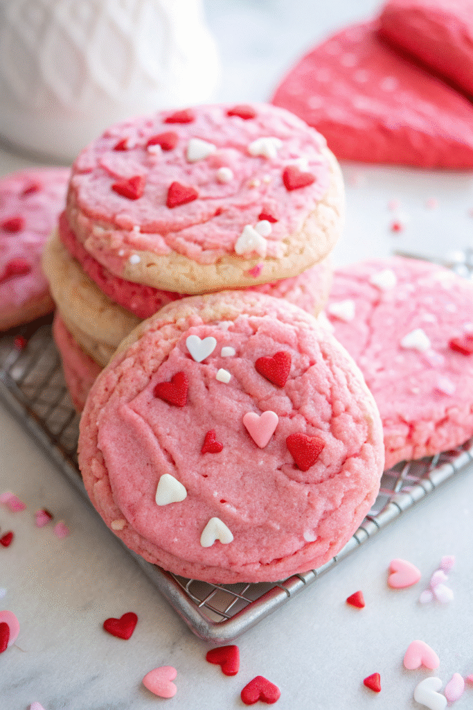 Absolutely! While strawberry cake mix gives these cookies their festive pink hue and classic Valentine’s flavor, you can easily substitute it with any other cake mix flavor. Chocolate, red velvet, vanilla, or even lemon cake mix would all work beautifully, allowing you to customize these cookies for any occasion or preference. The versatility of this recipe is one of its greatest strengths!