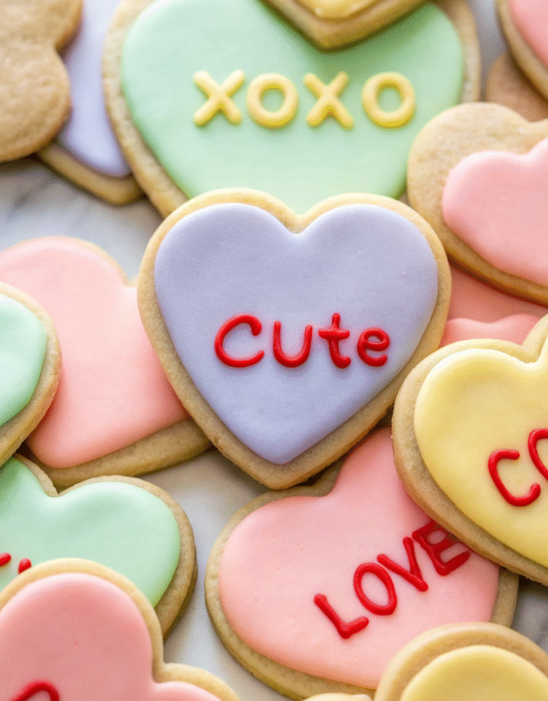 For the pictured conversation heart-style cookies, I used a 3.5-inch heart-shaped cookie cutter. This size provides a good surface area for piping messages and creates a satisfyingly substantial cookie. However, you can use any size heart cutter you like! Just keep in mind that smaller cookies might bake a minute or two faster, and larger cookies might need a little extra time. Adjust your baking time accordingly and watch for lightly browned edges.