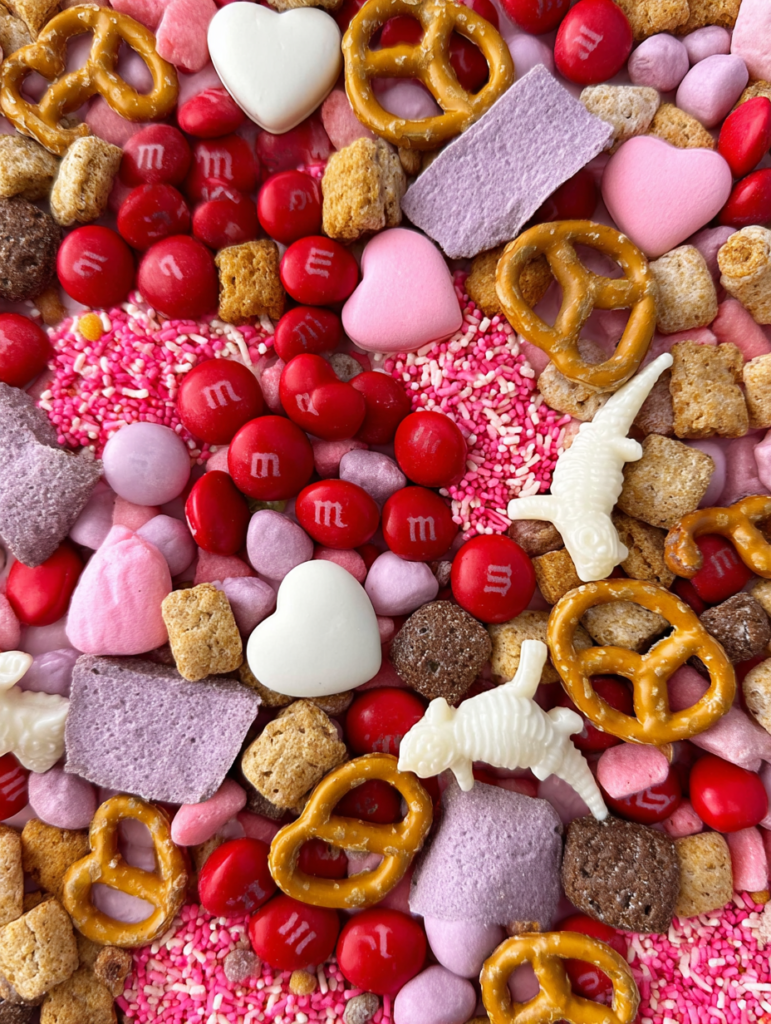 A colorful and crunchy Valentine’s Day snack mix that combines the fruity flavor of Very Berry Cheerios with salty pretzels and sweet Cupid’s Mix M&Ms.