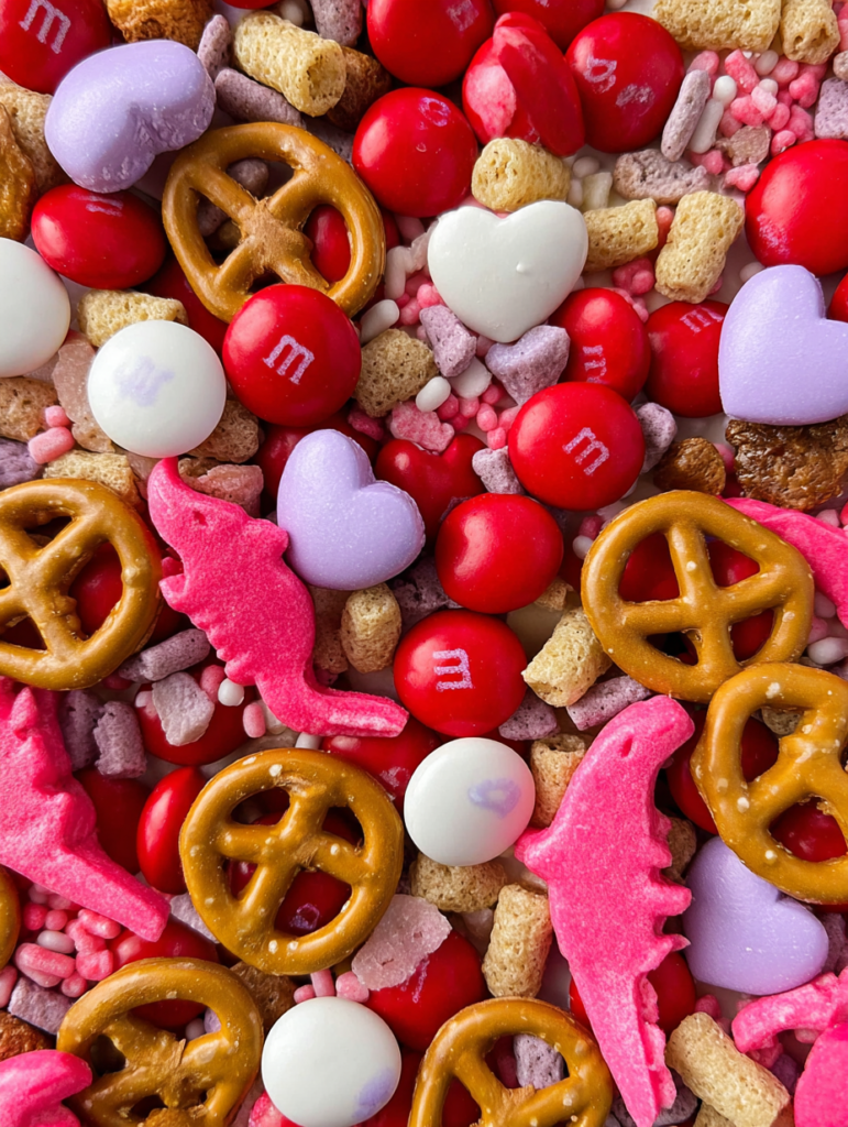 If you find yourself missing an ingredient or dealing with dietary restrictions, this mix is highly adaptable. For a peanut-free option, be sure to use the specific “Cupid’s Mix” M&Ms and check the packaging, or replace them entirely with semi-sweet chocolate chips or white chocolate chunks. If you cannot find Very Berry Cheerios, Strawberry Banana Cheerios or even Frosted Cheerios work well, though you may lose some of that signature pink color. For an extra crunch, you can swap the mini pretzels for pretzel sticks or even popcorn for a lighter, airier version of the mix.