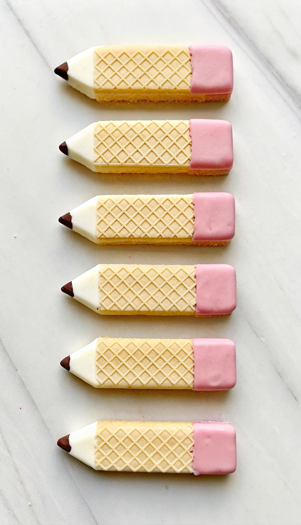 While wafer pencil cookies and pencil sugar cookies both mimic the look of real pencils, their taste and texture are quite different. Wafer pencil cookies are crunchy, airy, and light. The vanilla wafers provide a crisp bite, while the melted chocolate adds smooth creaminess. They’re also a no-bake treat, making them quicker to assemble.