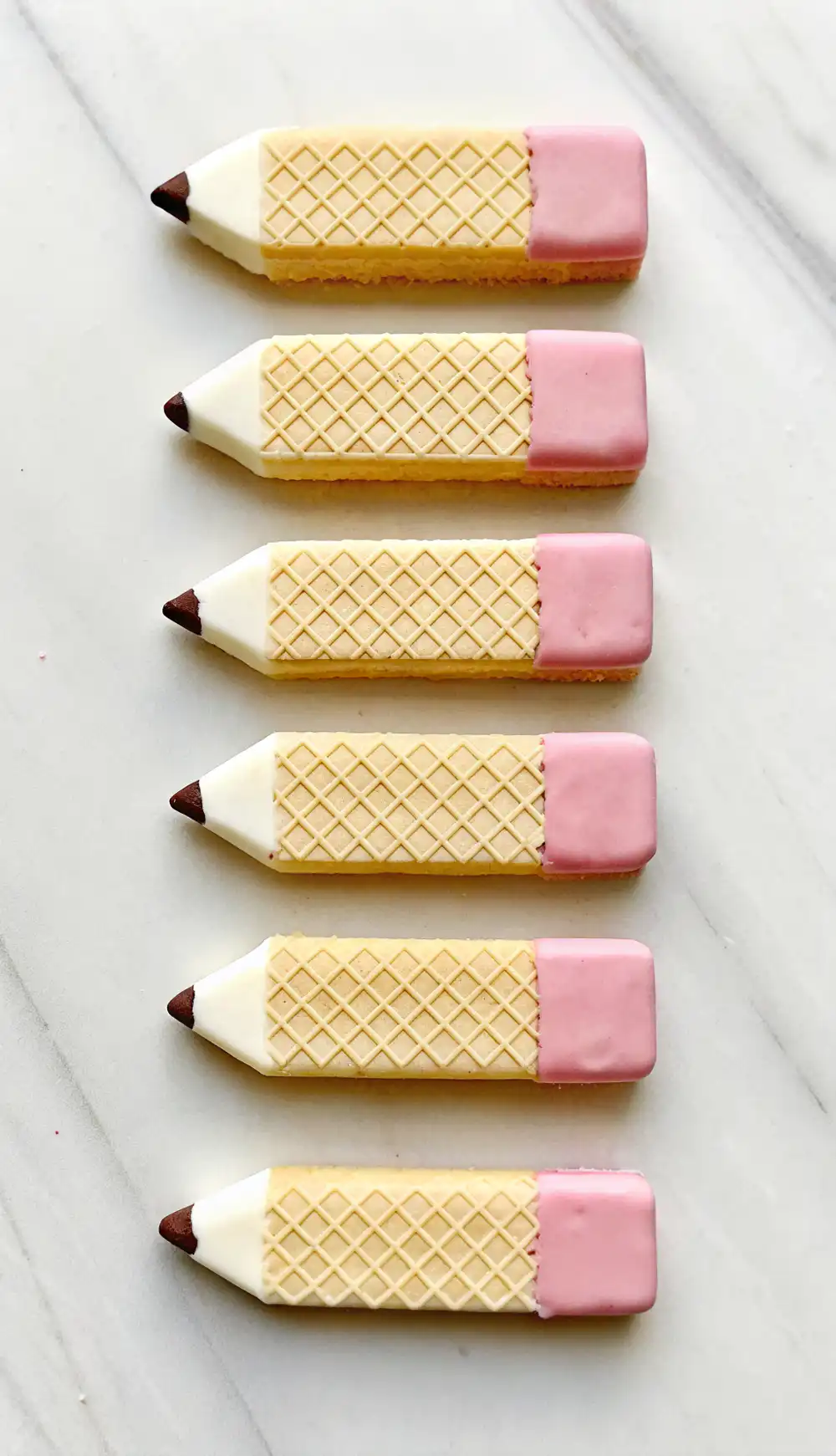 Wafer pencil cookies are playful treats designed to resemble real pencils, complete with a sharpened tip and eraser. They are made by cutting vanilla wafers into a pointed shape and decorating them with melted chocolate to mimic the wood, lead, and eraser ends. What makes them stand out is that they not only look like school supplies but also taste deliciously sweet and crunchy. Kids love the novelty, while adults appreciate the creativity, making them perfect for parties, school events, or edible gifts.